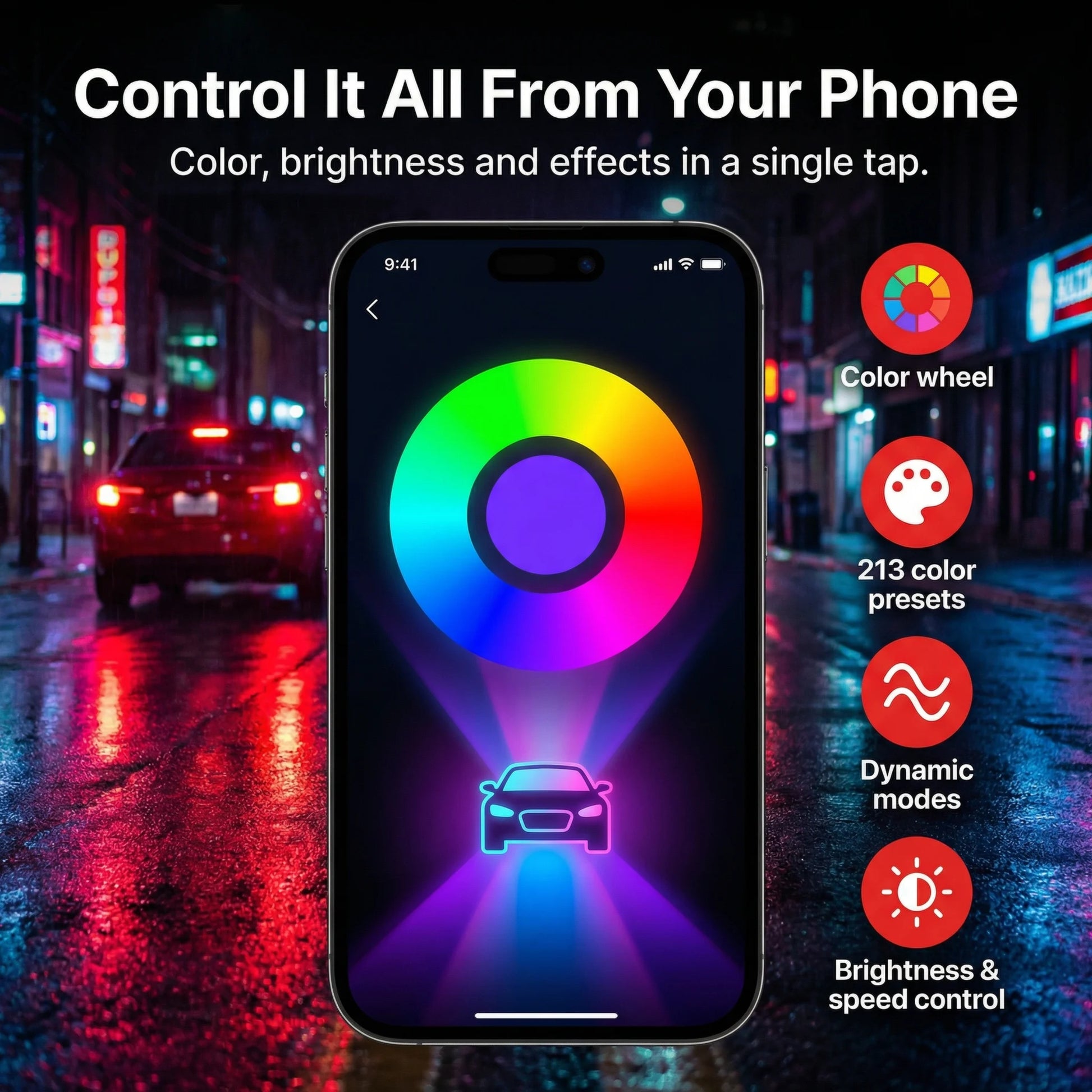 Pick solid colors or flowing symphony modes to match your mood or music.